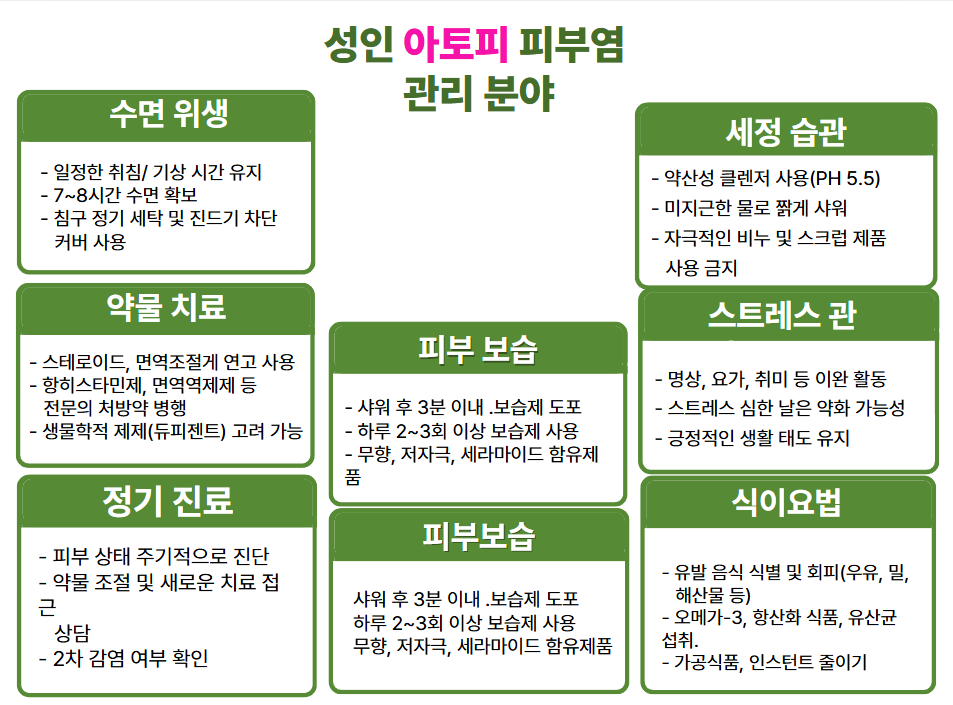 성인 아토피 피부염은 단순한 피부 질환이 아닌, 전신 건강과 생활습관 전반에 영향을 받는 만성 질환입니다. 따라서 피부를 직접적으로 관리하는 것뿐만 아니라, 정신 건강, 식단, 수면, 환경 등 모든 생활 요소를 종합적으로 점검하고 꾸준히 관리해야 합니다.